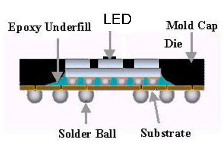 A new type of encapsulation method can effectively solve the problem of heat dissipation, SMT, and can promote the reliability of the product, very high density of pixels to be led array. New packaging is a new type based on BGA, CSP leds encapsulation. Chip and led constant current drive logic wafer packaging together, structure mainly include seven parts: epoxy body, IC chip, wafer, support body, interconnection layer and solder ball (or bumps, welding column), the protective layer. Interconnection layer through the load with automatic welding (TAB), wire bonding (WB), flip chip (FC), and other ways to implement the chip with solder ball (or bumps, welding column), the internal connection between part isthe key to the packaging.